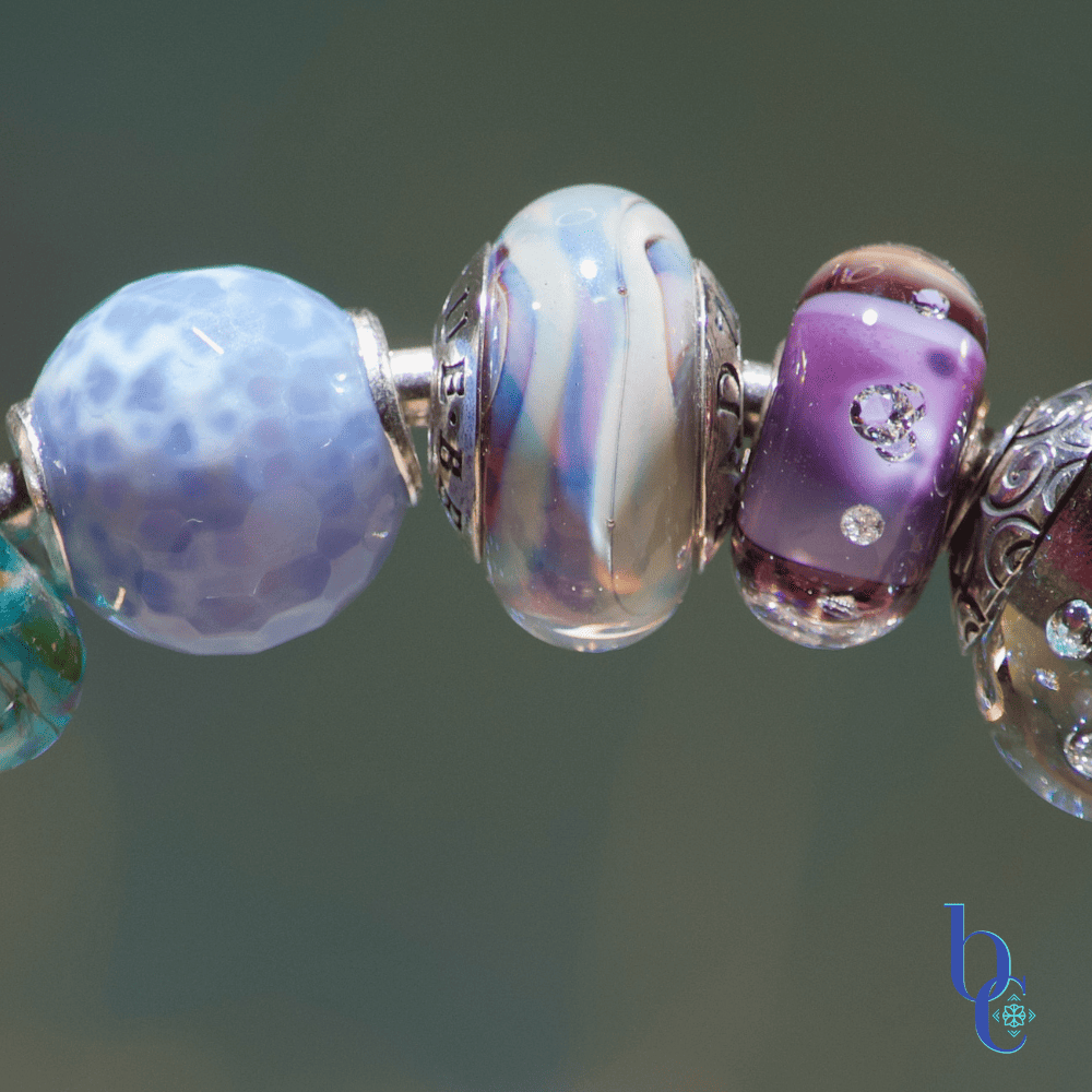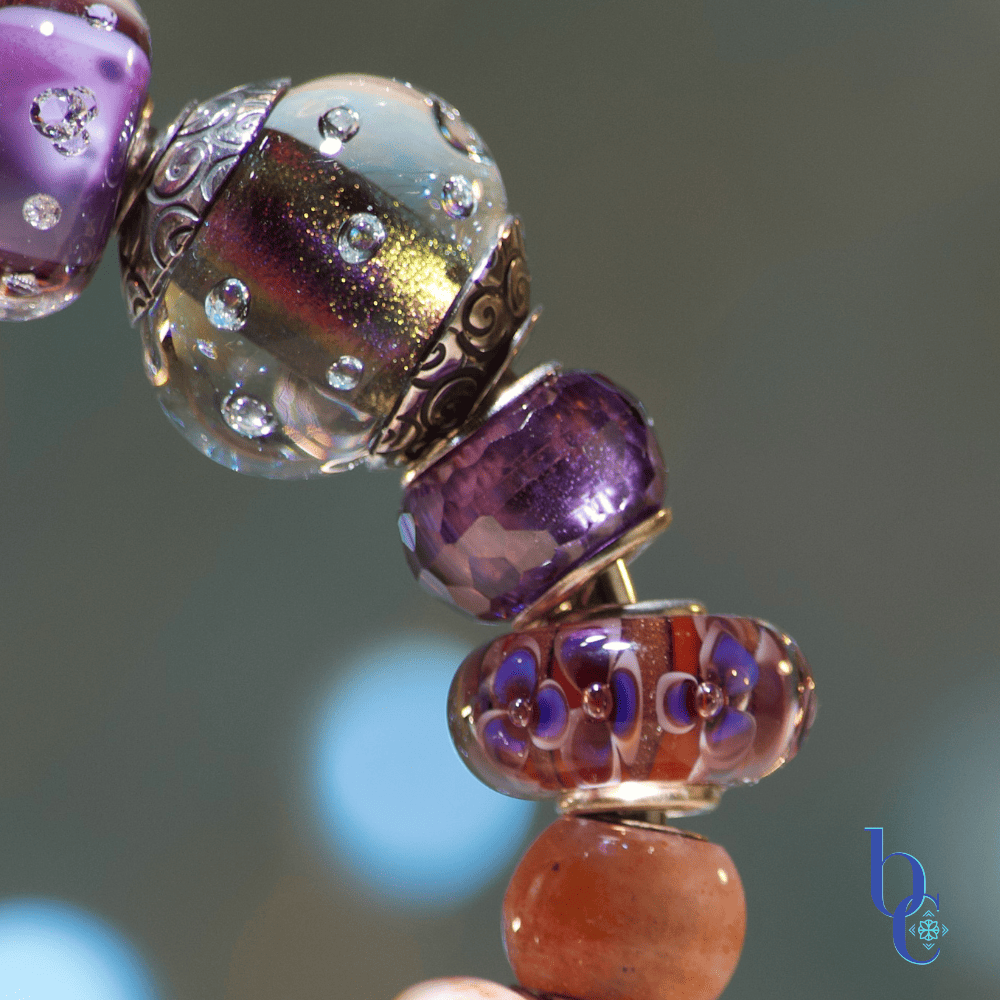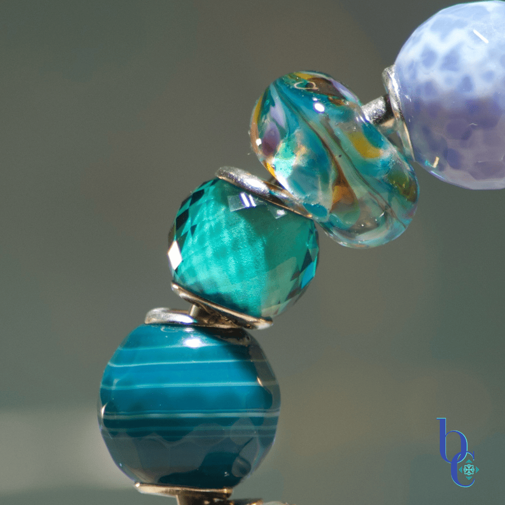 The Photographer’s and Educator’s POV here is that asymmetrical design creates interest, but curation creates harmony. Every bead provides a standalone focal point. We curated the tactile journey by combining the smooth, luminous shimmer of the dichroic and artisan lampwork glass with the raw, natural sparkle and the deep chatoyancy of sunstone. Adding these natural elements, whether they are polished smooth or faceted, creates a powerful feeling of the entire coastal ecosystem—from sea spray to shimmering sand—right on your wrist.