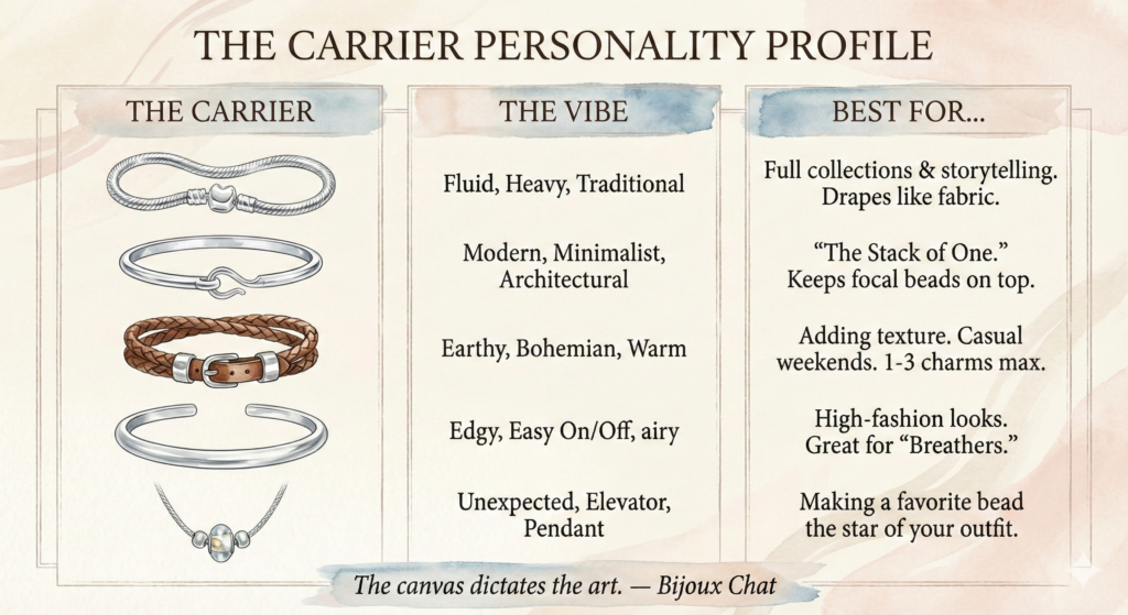 In the world of European charm collecting, we often obsess over the beads—the glass, the sparkles, the characters. But the “Carrier”—the bracelet or necklace holding it all together—is the unsung hero. It is your canvas. And if you’re still using the same standard snake chain for every single mood, you are missing half the fun.